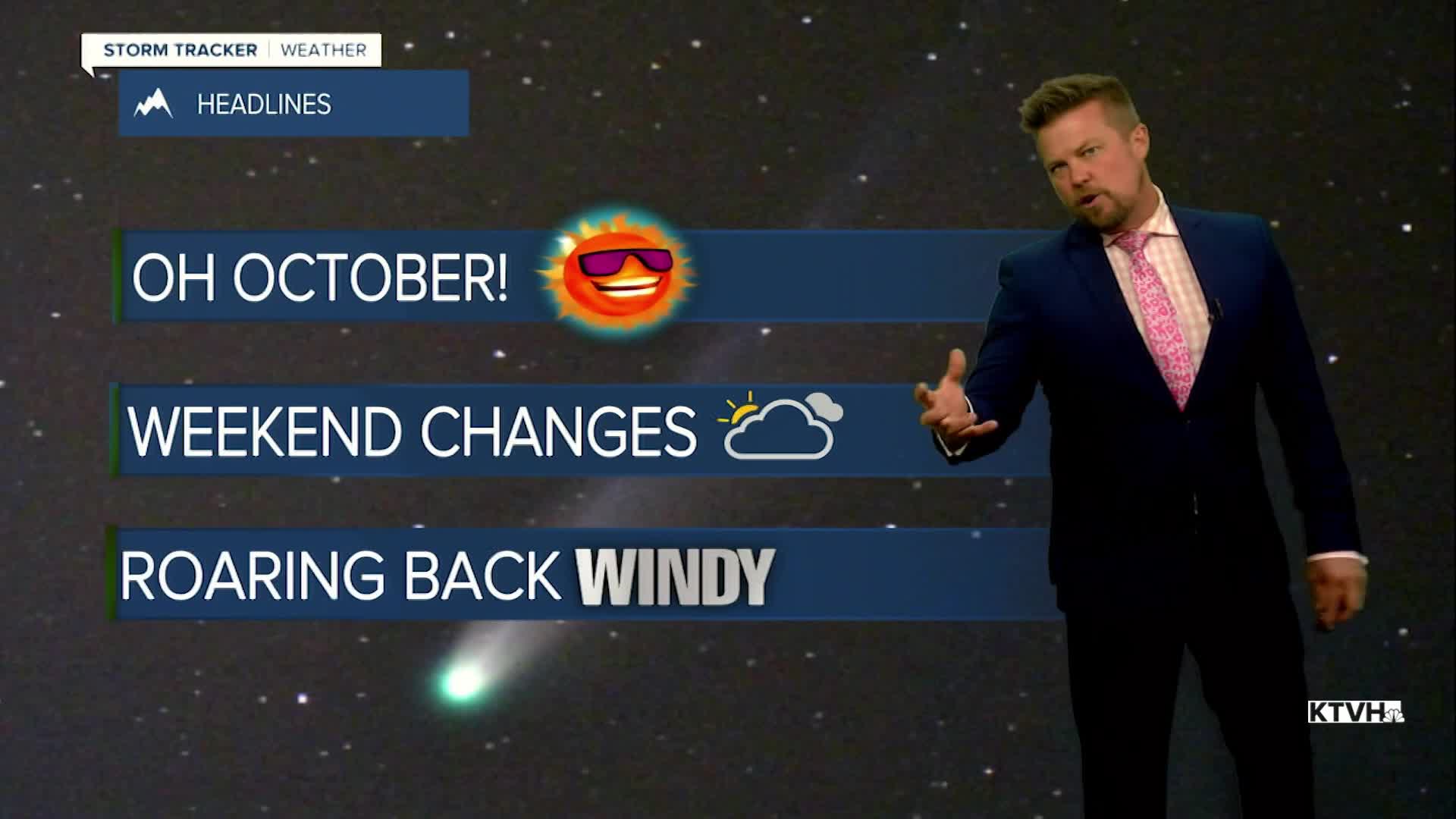 A beautiful stretch of dry, sunny and mild October weather will continue for a few more days but some changes are headed to Montana for the weekend. There are not watches or warning, the weather will remain tranquil for the rest of the workweek. Skies will be mainly clear with good viewing for the Orionid Meteor Shower at night. Comet Lemmon is still visible in the western sky about 2-3 hours after sunset, and binoculars are helpful in finding the comet. Thursday will be nice as well with mostly sunny skies, highs in the 50s and 60s, with a bit more wind picking up across the plains. Friday will be partly cloudy and warm with highs mainly in the 60s to around 70. Southwest wind will increase across the plains once again. This coming weekend will be unsettled as two fronts will move through the state. Saturday's front will bring more wind and showers closer to the Continental Divide later in the day. Highs will reach the 50s to around 60, wind could gust higher than 40mph. Sunday will be colder with highs in the 40s and 50s, cold enough for some snow in the mountains and a mix of rain and snow showers in the lower elevations. Right now, any snow accumulation will be confined to the mountains. This does not appear to be a powerful storm, but anyone heading into the mountains this weekend should prepare for chilly and damp conditions. Cool, blustery weather will continue early next week but not major storms are on the horizon at this time.