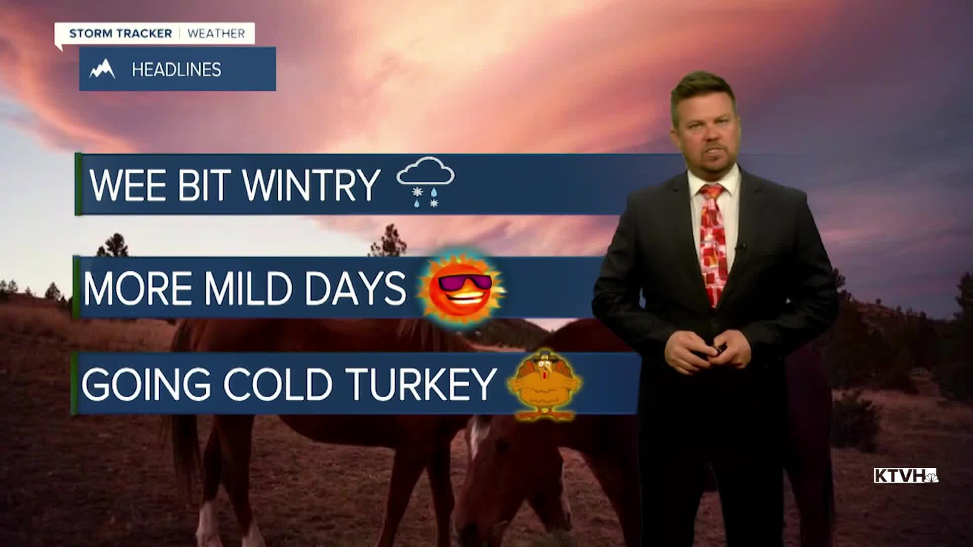 November has been mild and fairly dry, but things are going to change in the few days before Thanksgiving. Much colder air is highly likely, and there's a chance for some light snow before and right after Thanksgiving. The end of November and beginning of December will be much different than the last several weeks. A weak cold front will move through the state on Wednesday morning with a little light snow possible around Helena out to about Lewistown. By the afternoon, most of the state will turn mostly sunny as the storm system moves away. Highs will be cooler in the 30s and 40s. Wednesday night will be a chilly night with lows in the 10s and 20s. Thursday will be a beautiful day with mostly sunny skies, light wind and highs in the 40s and 50s. The wind returns to the plains on Friday but the sun will continue to be bright. Gusts could top 40mph along the Rocky Mountain Front. Highs will top out in the 50s. This weekend will be dry, partly cloudy and mild. Highs will stay above average in the 50s. Monday will be mostly cloudy, mild and windy ahead of a cold front that will change the recent pattern. Much colder air will arrive for Tuesday with some snow showers. Right now travel conditions on Wednesday do not look bad for Montana. It should be quite cold but mainly dry through Thanksgiving.