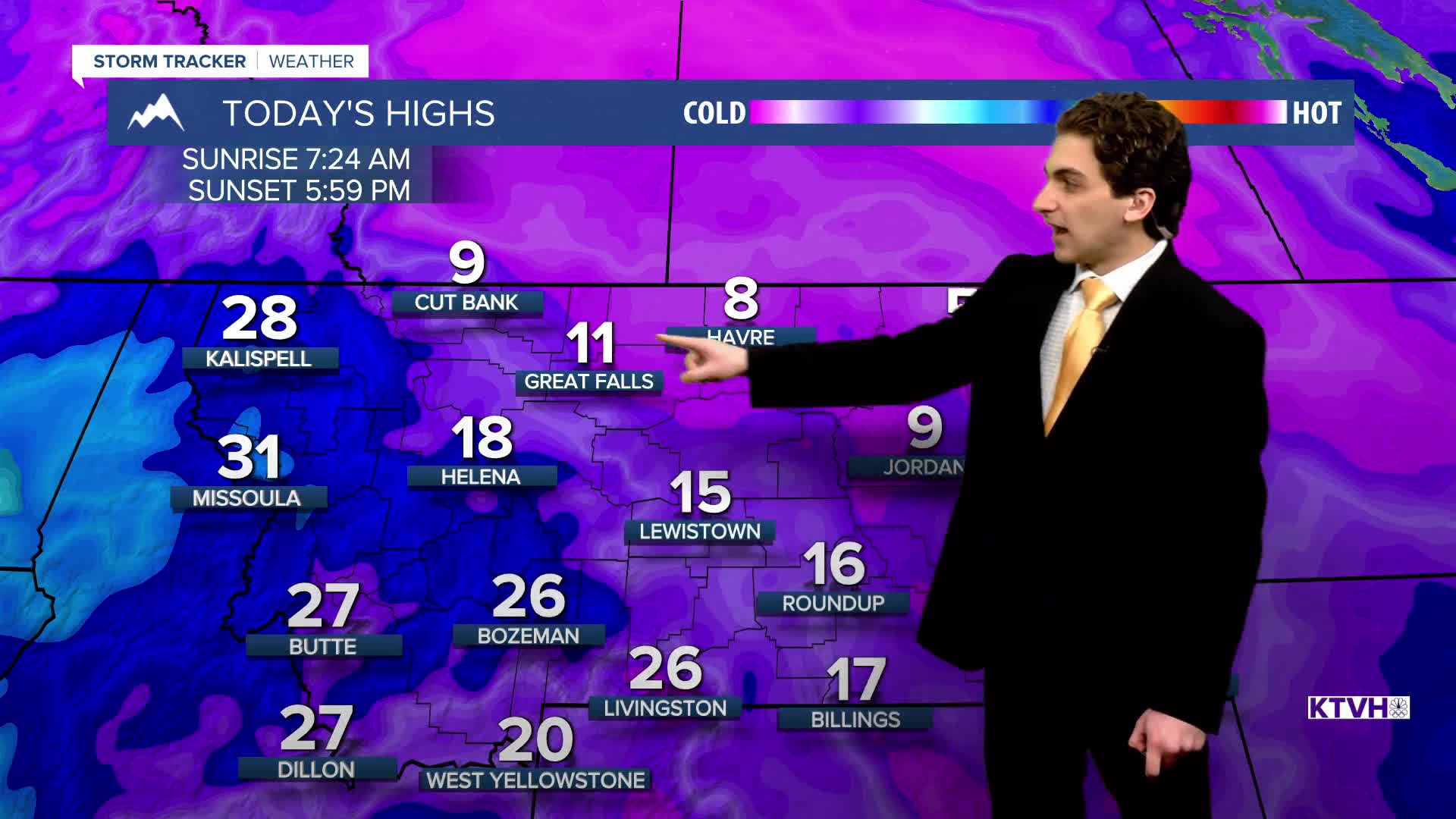 THURSDAY, FEBRUARY 19TH: Today will be another cold day. Lows have dipped into the -20s for some, with wind chills in northeast Montana between -30° and -40°. Highs only reach the single digits and teens. Pop-up snow showers will form in the mountains of southwestern Montana in the afternoon, causing minimal impacts to most.