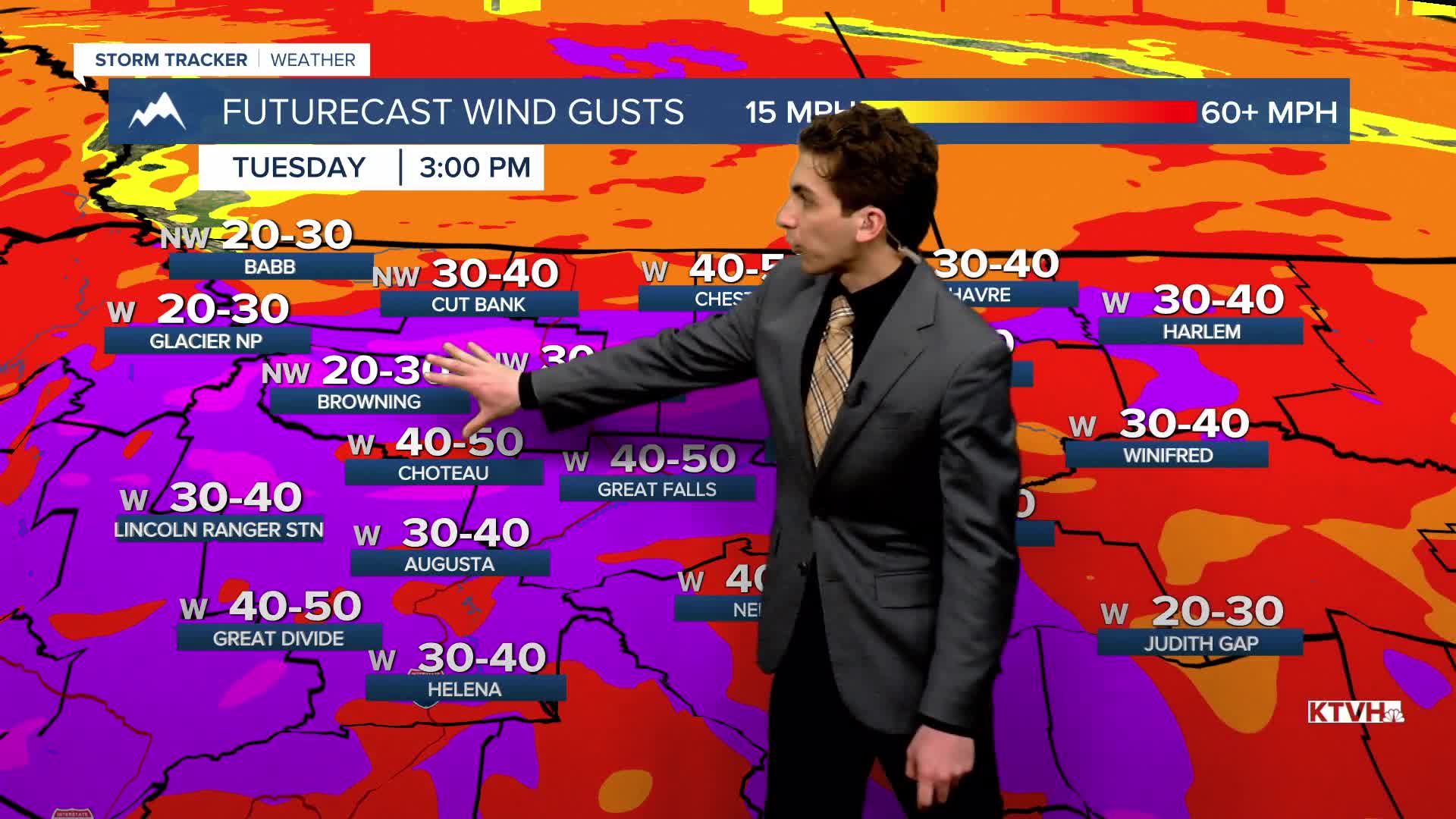 TUESDAY, APRIL 7TH: A strong wind event is set to unfold on Tuesday, especially in the afternoon hours across much of central and southwest Montana. A low-pressure system with an associated cold front will move into the area. This, combined with strong mid-level winds, will enhance surface-level winds. Gusts could reach up to 75 MPH in lower elevations, with the Rocky Mountain Front gusting to near 90 MPH at times.
