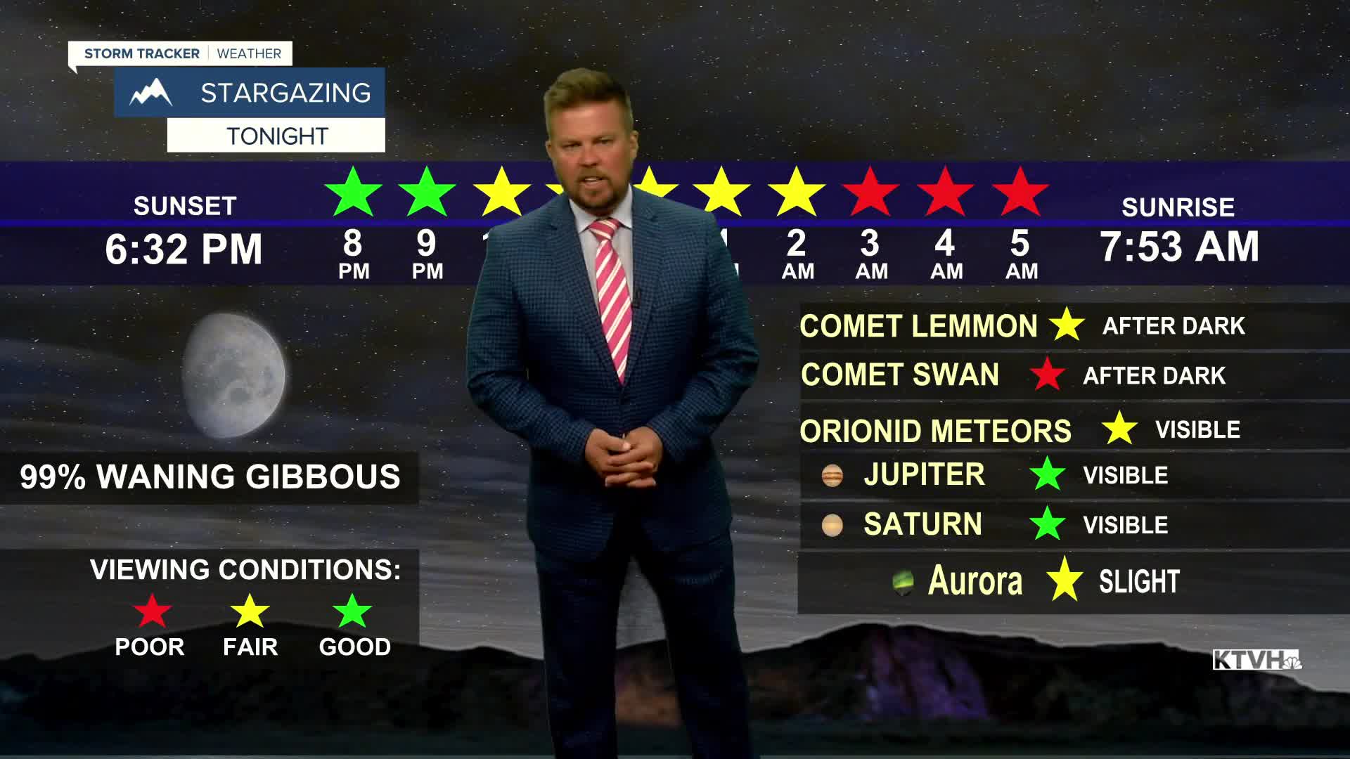 After a chilly, stormy weekend, the workweek looks pretty nice with warming temperatures, some lighter wind, and a good amount of sunshine. Skies will be clear some nights as the Orionid Meteor Shower peaks, and Comets Lemmon and Swan move across the night sky. For the meteor shower, up to 10-20 meteors an hour are possible. Comet Lemmon should be visible to the naked eye near the Big Dipper constellation the next few nights. Comet Swan is higher in the sky and might need binoculars. Tuesday will be a partly cloudy day with wind across the plains and over the Continental Divide. Highs will top out in the 50s to around 60. Wind gusts will peak around 30mph across the plains but the wind will be much lighter in most of the valleys. Wednesday will be a beautiful October day with mostly sunny skies, light wind across the state, and highs in the 50s and 60s. Thursday will be nice as well with partly cloudy skies, highs in the 50s and 60s, with a bit more wind picking up across the plains. Friday will be partly cloudy and warm with highs mainly in the 60s to around 70. Southwest wind will increase across the plains once again. This coming weekend will be unsettled as two fronts will move through the state. Saturday's front will bring more wind and showers closer to the Continental Divide. Highs will reach the 50s to around 60, wind could gust higher than 40mph. Sunday will be colder with highs in the 40s and 50s, cold enough for some snow in the mountains and a mix of rain and snow showers in the lower elevations. Right now any snow accumulation will be confined to the mountains.