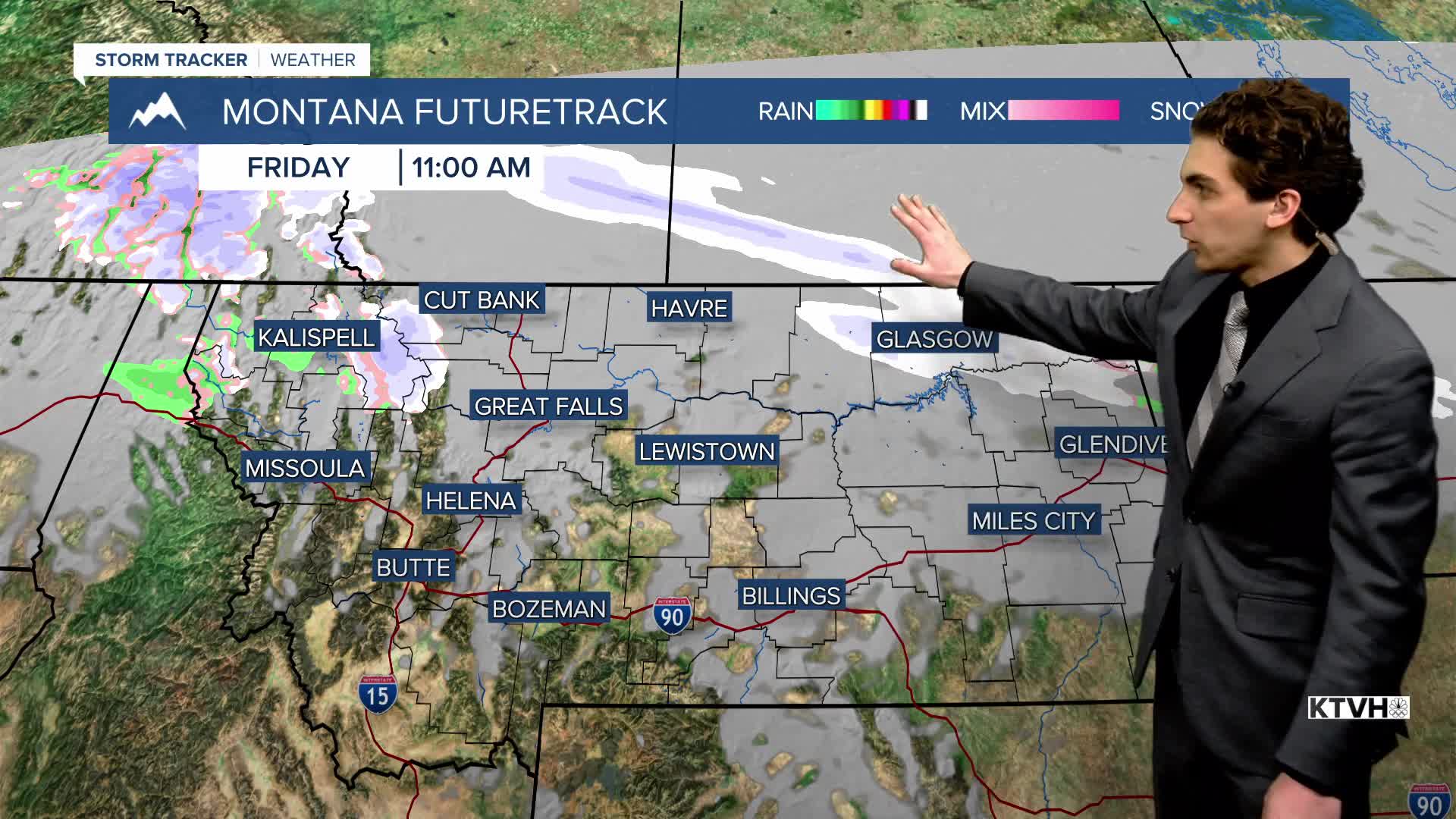 FRIDAY, FEBRUARY 27TH: Gusty west winds will still stay in the forecast through the morning, but a Canadian front from the north will reduce the wind threat from north to south by Friday evening in the plains. The Continental Divide will remain windy throughout the day, with gusts around 50-60 MPH. Highs will reach the 40s and 50s before arctic air arrives, with a bit of lower-elevation snow northeast of the Great Falls area.