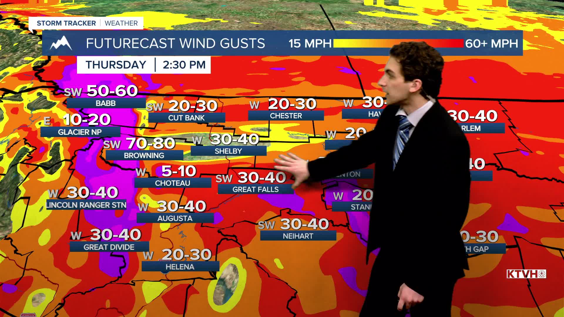 THURSDAY, MARCH 19TH: West of I-15 is where the strongest winds will be today in north-central Montana. We have already had multiple recorded triple-digit gusts near the Rocky Mountain Front this morning. A High Wind Warning continues for the Rocky Mountain Front for the rest of the day.